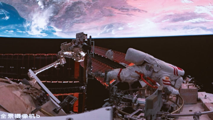 ↑這是9月25日晚在北京航天飛行控制中心屏幕上拍攝的神舟二十號乘組航天員王杰在空間站組合體艙外作業的畫面。新華社記者李明剛 攝
