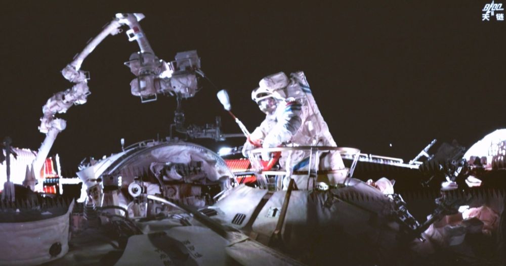 ↑這是5月22日在北京航天飛行控制中心屏幕上拍攝的神舟二十號航天員陳冬出艙的畫面(視頻截圖)。新華社記者厲彥辰 攝