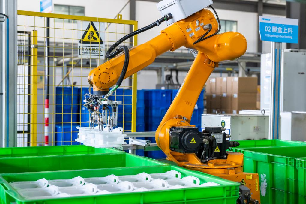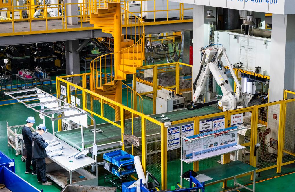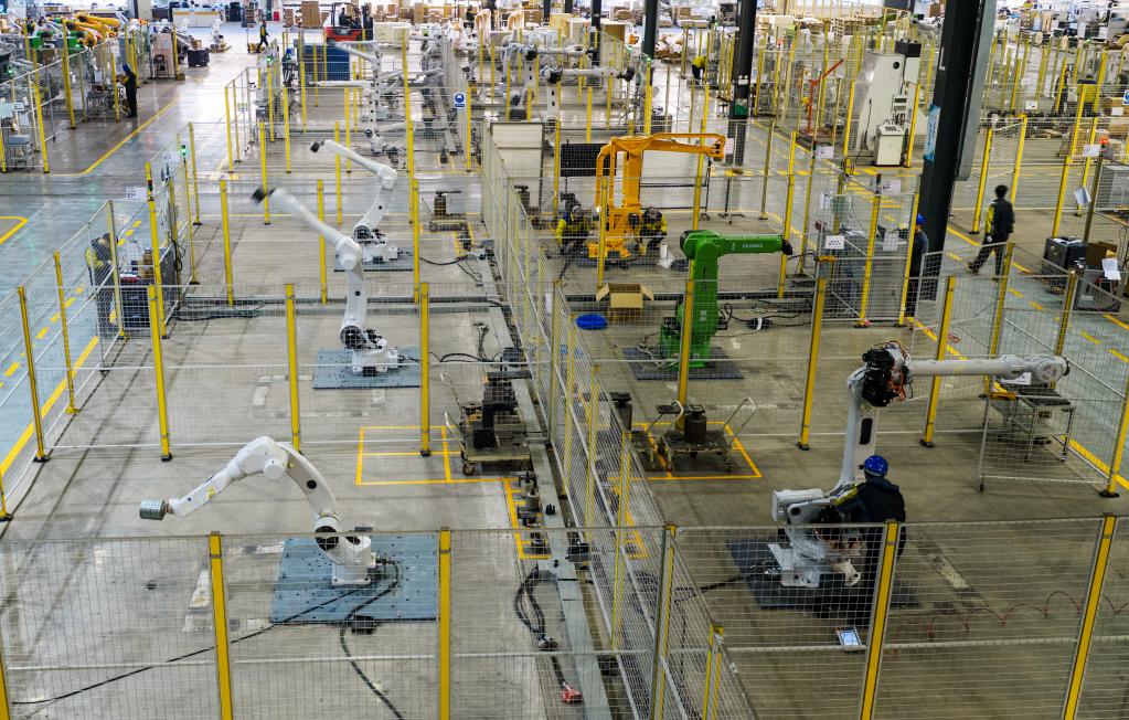 11月14日,在位于蕪湖市灣沚區的安徽世圓新能源科技有限公司,工業機器人在沖壓自動化線上作業。