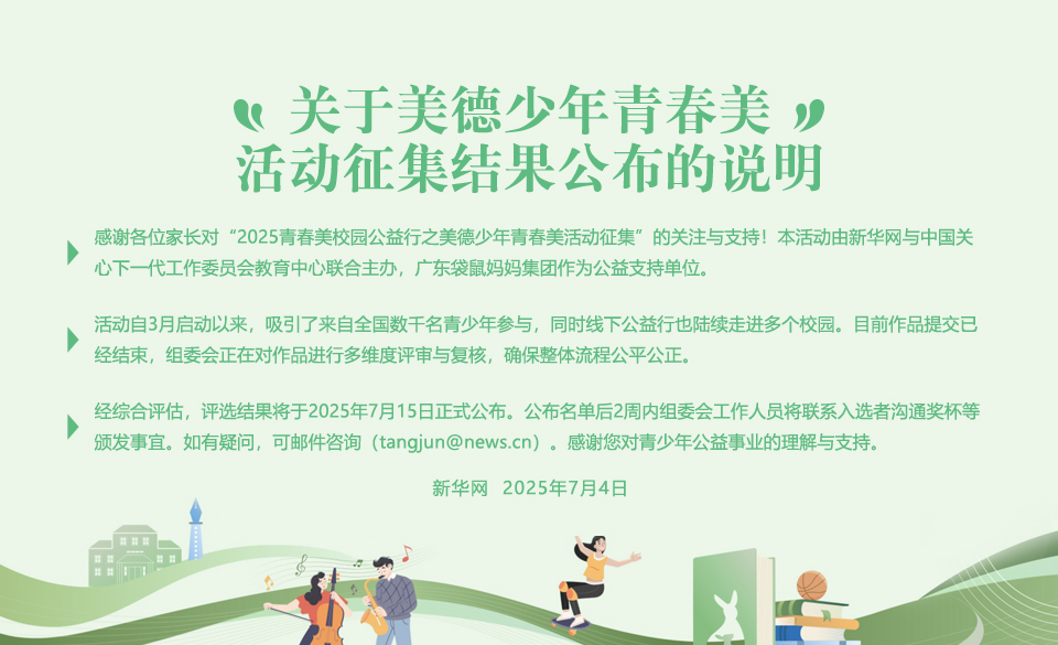 為展現當代青少年積極向上的精神風貌,喚醒最美青春力量,引領當代萬千少年探索多姿多彩的世界,中國關心下一代工作委員會教育中心、新華網、廣東袋鼠媽媽集團聯合發起“2025袋鼠媽媽青春美校園公益行”,同步開啟“袋鼠媽媽美德少年青春美活動征集”(以下簡稱“活動征集”)。