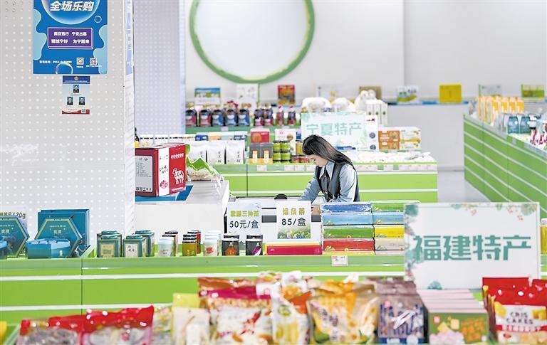 12月9日,工作人員在獅城寧好電商網批(西部)運營基地展銷區整理貨物?;匚挥趯幭膮侵沂宣}池縣,是福建石獅與寧夏鹽池跨地域商業合作示范基地,為當地打造電商模式新業態。馮開華攝(新華社發)