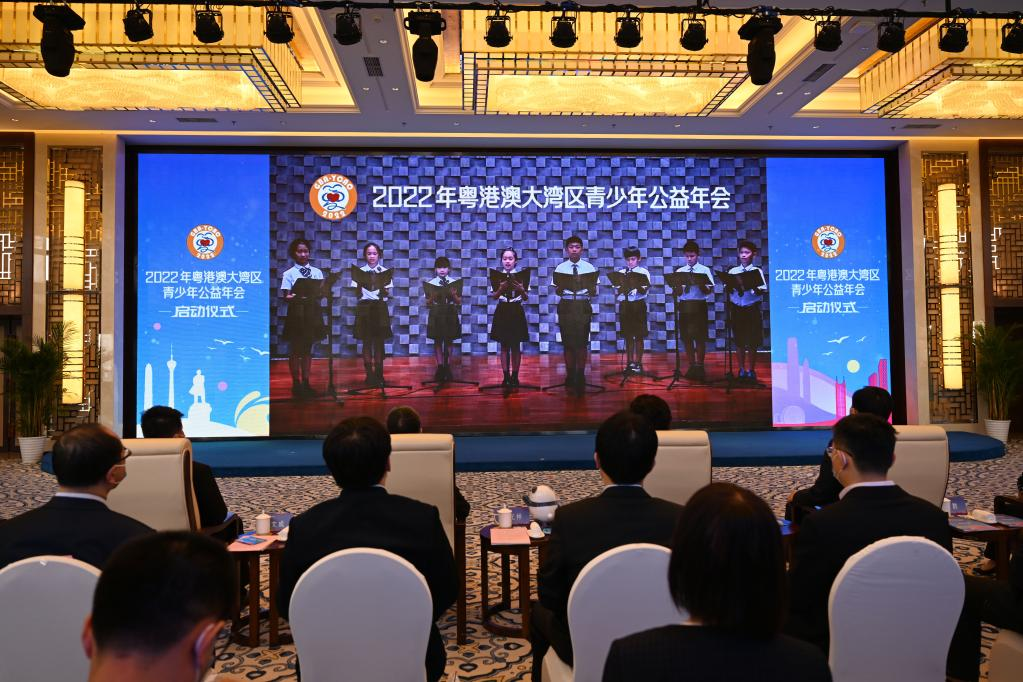 4月23日,學生在2022年粵港澳大灣區青少年公益年會啟動儀式上視頻連線表演詩歌朗誦《香江贊》。新華社記者金良快 攝
