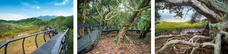 荔枝窩自然步道(左),步道兩旁攀援的古木(中),縱橫交錯的紅樹林(右)(圖片來源:香港旅游發展局)