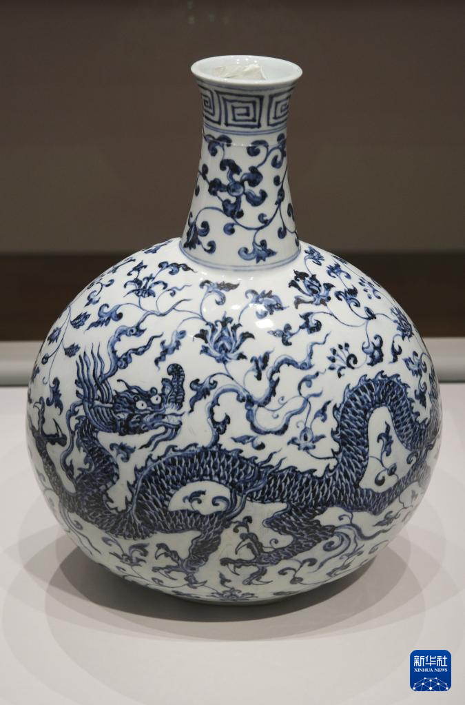6月28日在香港故宮文化博物館拍攝的明代青花龍穿花紋扁壺。