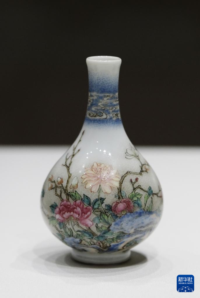 6月28日在香港故宮文化博物館拍攝的清代琺瑯彩花卉圖題詩句瓶。