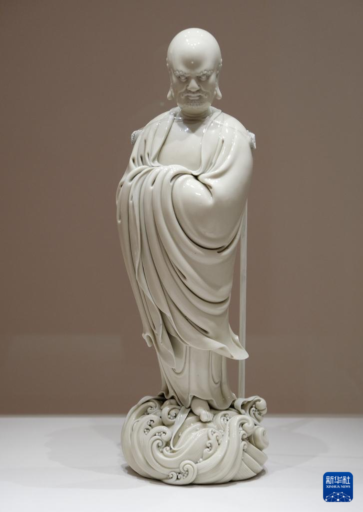 6月28日在香港故宮文化博物館拍攝的明代德化窯白釉達摩渡江立像。
