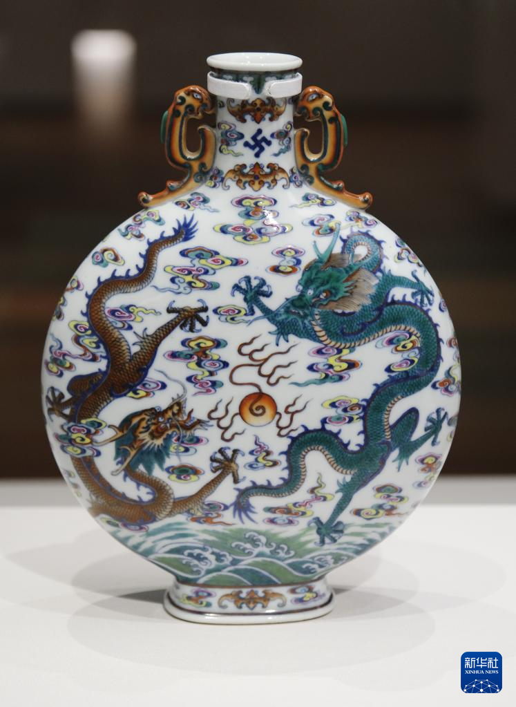 6月28日在香港故宮文化博物館拍攝的清代斗彩云龍紋雙耳扁壺。