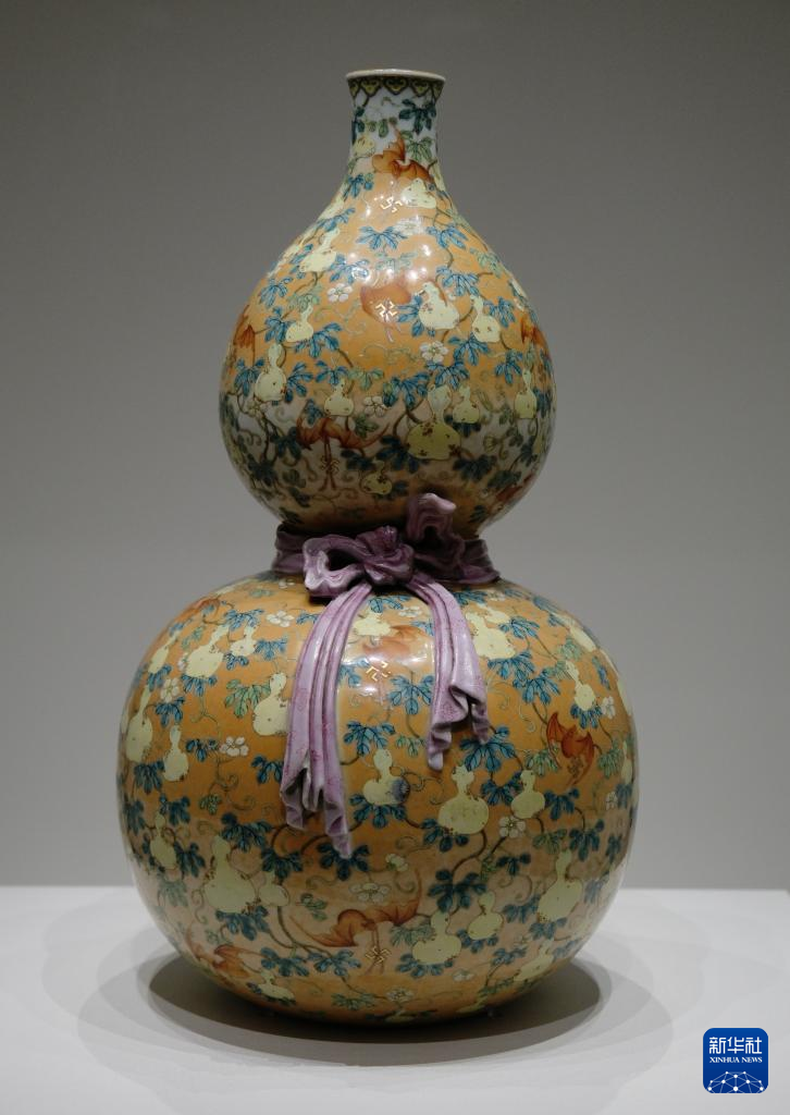 6月28日在香港故宮文化博物館拍攝的清代粉彩福祿萬代紋葫蘆瓶。