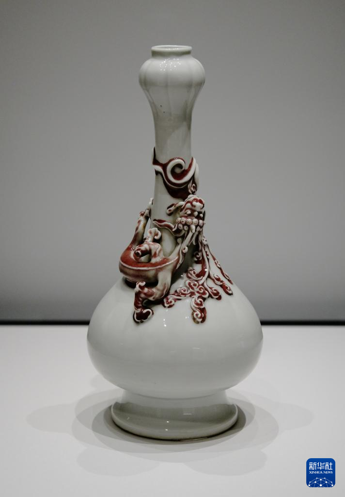6月28日在香港故宮文化博物館拍攝的明代白釉塑貼鮮紅釉蟠螭蒜頭瓶。