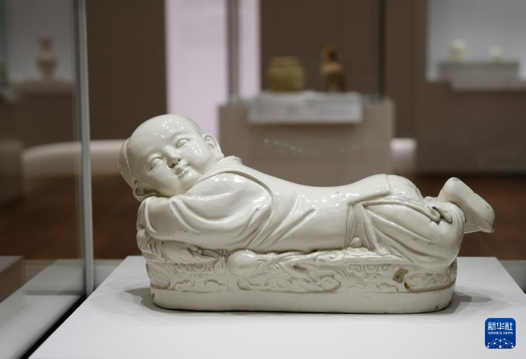 6月28日在香港故宮文化博物館拍攝的北宋定窯白釉孩兒枕。