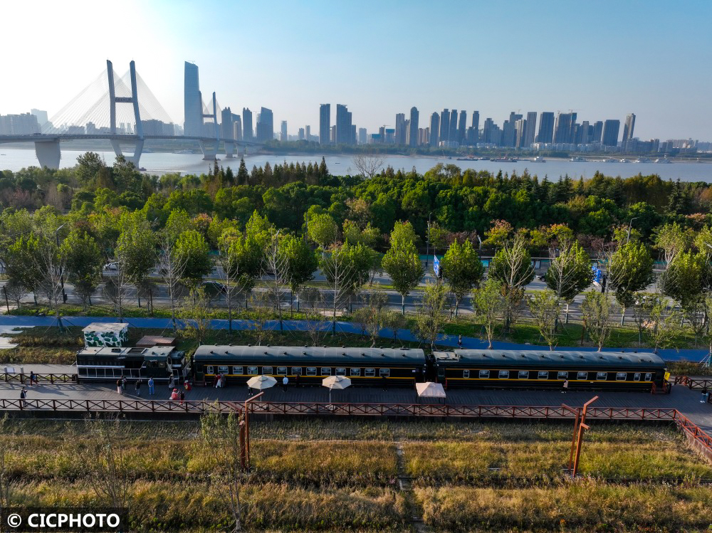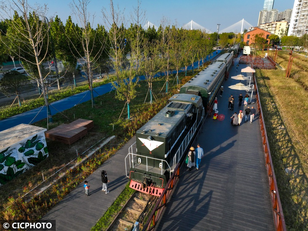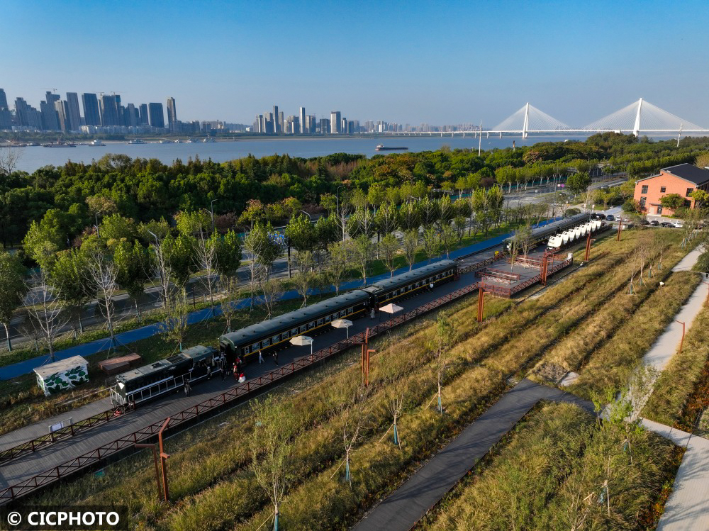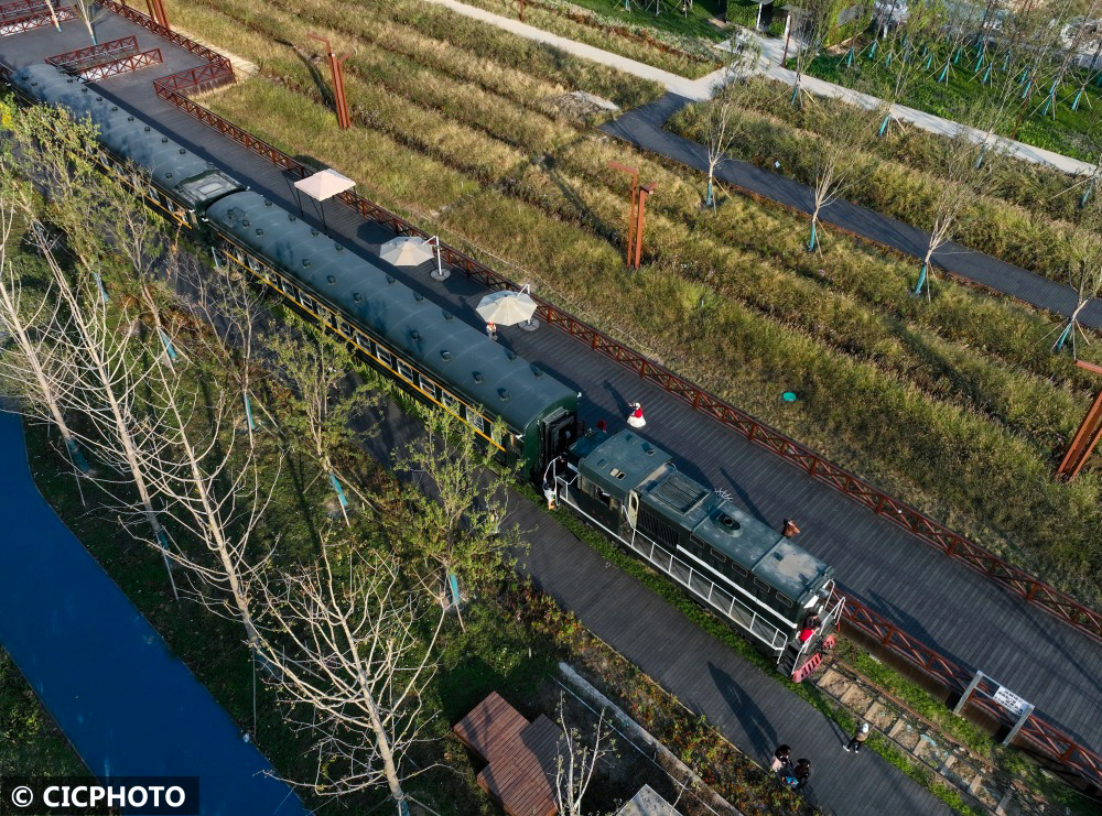 ↑2022年10月31日在湖北省武漢市武昌區拍攝的綠皮火車公園。(無人機照片)CICPHOTO/趙軍 攝
