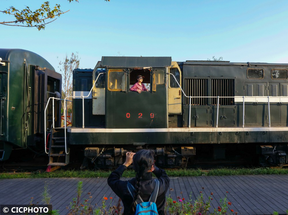 ↑2022年10月31日,游客在湖北省武漢市武昌區綠皮火車公園內拍照。(無人機照片)CICPHOTO/趙軍 攝