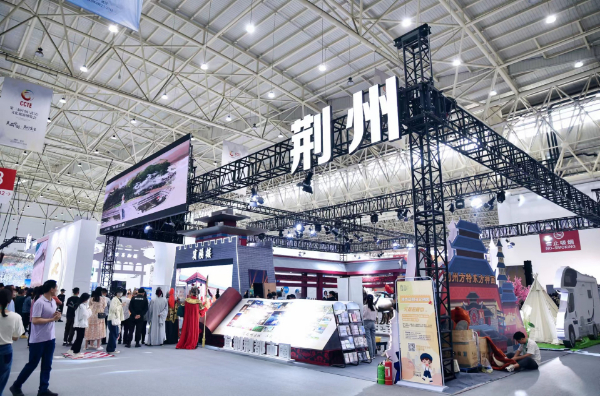 展臺設置重點旅游景區的實景互動展示區、特色旅游商品展示區與美食打卡體驗區。表演區通過LED大屏結合荊州古城墻造型,展示荊州古城賓陽樓的秀美風光和“中國南方不可多得的完璧”的神韻。同時,展館展出300多件旅游商品、非遺文創和荊楚美食,包括荊州魚糕、公安牛肉等荊州本地特產美食,荊州博物館的精美絲巾、楚式繡品、荊州地標文創雪糕、文創巧克力等文創商品,以及荊州漆木器、貝雕、烙畫小葫蘆等非遺項目。