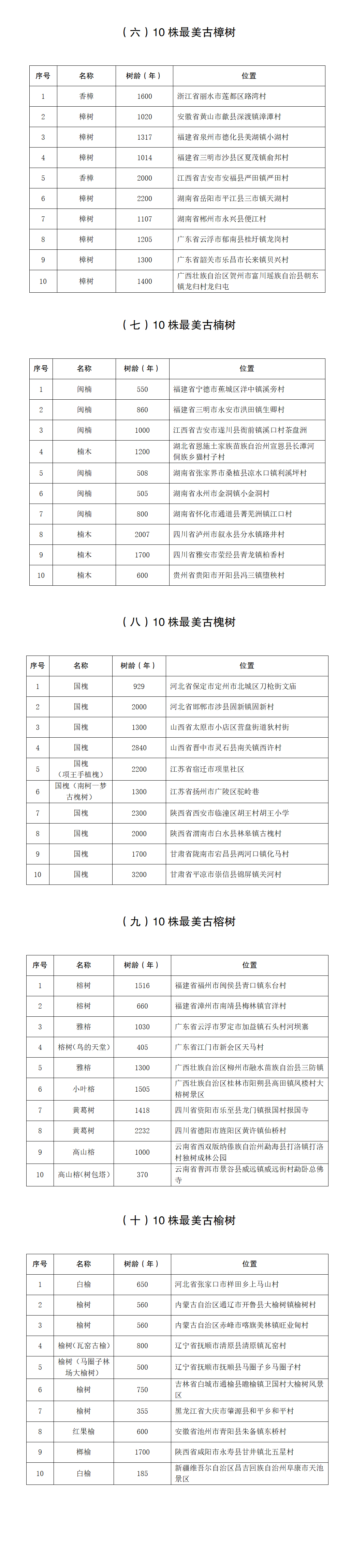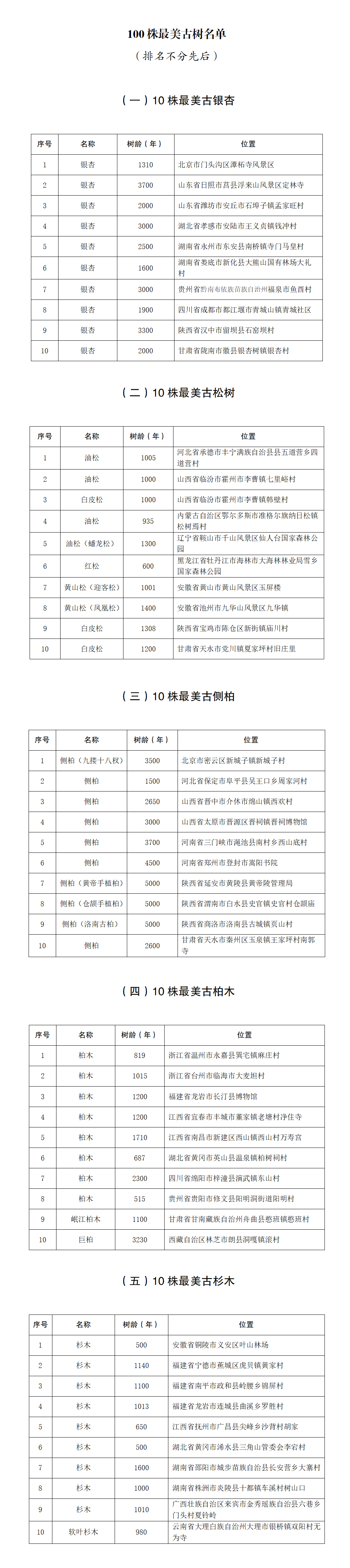 經過公眾投票、專家評審、全網公示等環節,從全國各地推選出黃帝手植柏、黃山迎客松、北京潭柘寺帝王樹等100株最美古樹和蜀道翠云廊古柏群、林芝巨柏古樹群、利川古水杉群等100個最美古樹群。