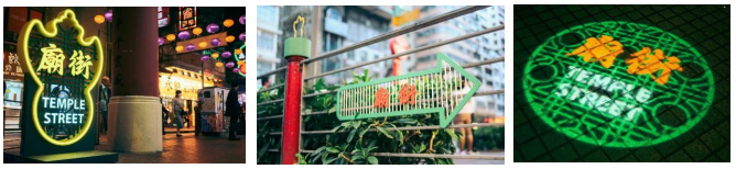 “藝綴廟街”沿廟街多個地點設置具有??港及廟街元素的發光打卡藝術設施、特?路標及投影裝飾等,營造五光??的感覺,讓晚上的廟街更顯璀璨。沿佐敦道也放置了多個指路圖案,引領?家逐步??廟街,??尋覓意想不到的驚喜。