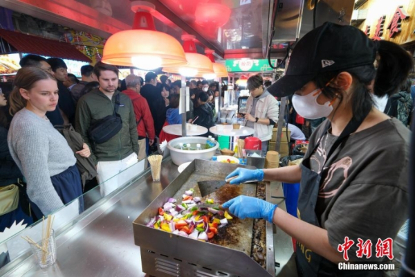 廟街夜市的美食攤檔,吸引旅客光顧。中新網記者 陳永諾 攝
