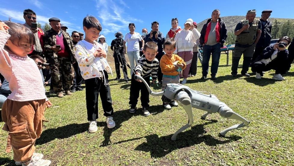 科普大篷車開進新疆阿勒泰青河縣套查干湖夏牧場,當地小朋友和機器狗互動。(新疆科技館供圖)