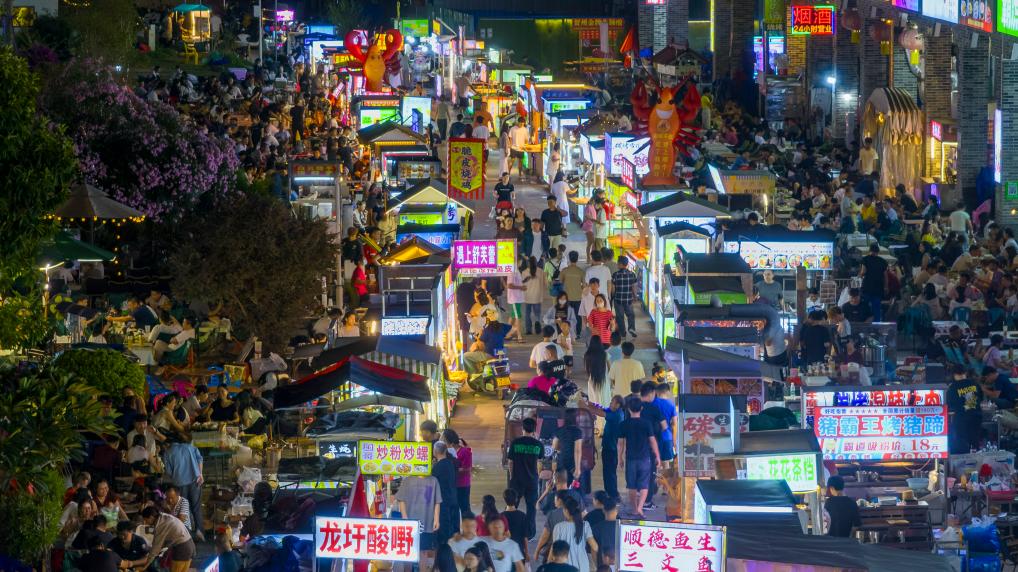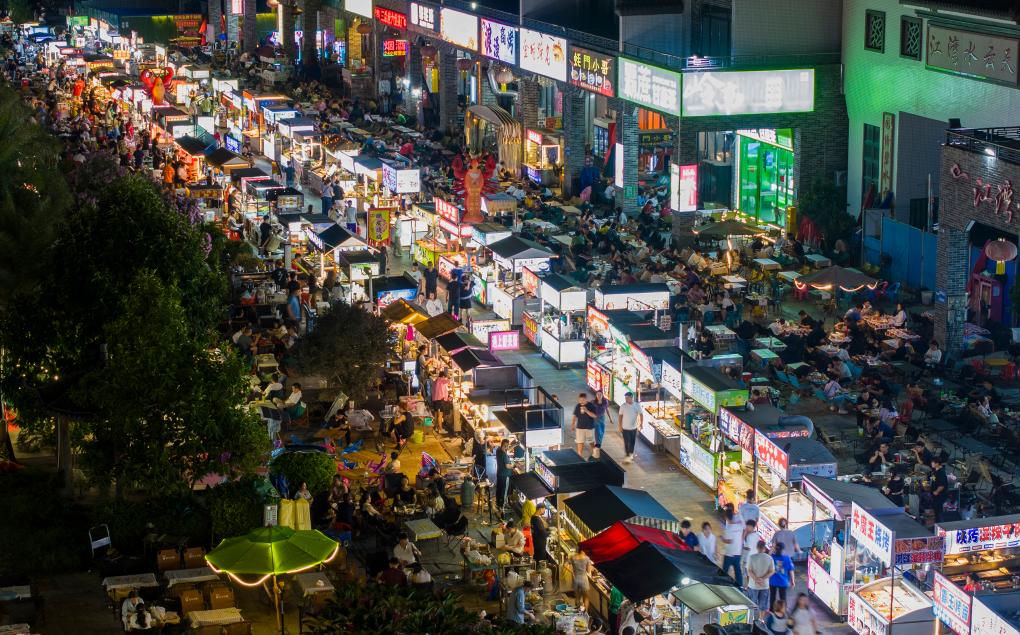2025年10月19日,市民和游客在廣西梧州市長洲區紅嶺街道水云天夜市品嘗當地美食。(無人機照片)CICPHOTO/何華文攝