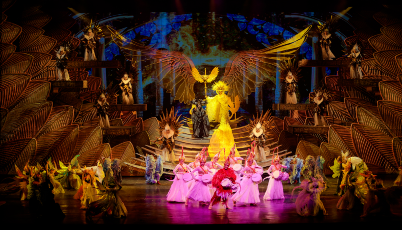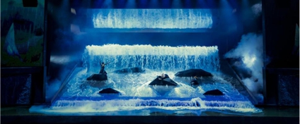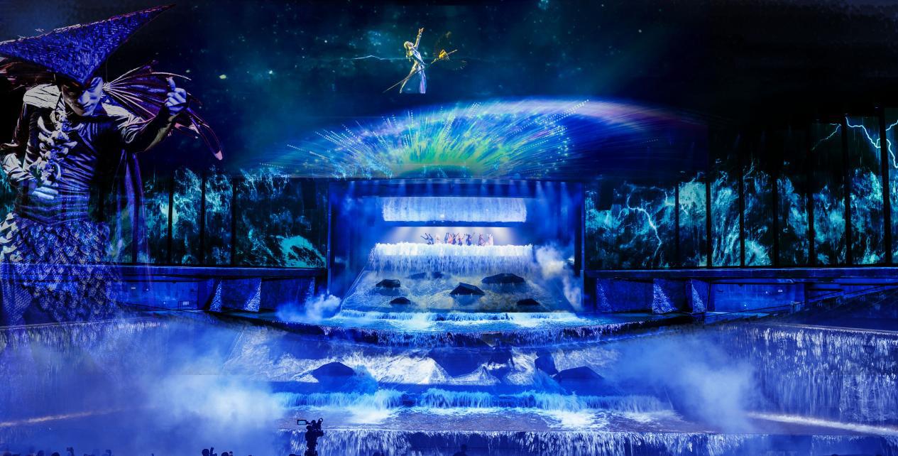 在舞美設計方面,利用多種形式和特技打造視覺盛宴。想象未及的舞臺奇景,不僅保留了原版純潔靈動美輪美奐的白孔雀,和數百噸洪水席卷舞臺的奇觀,更是新增了一見動容的魅力科技,以開合大屏、冰屏陣列、高清LED陣列,高清投影組成的180度沉浸式多媒體舞臺,視覺層次豐富,完美地將多媒體與演員表演結合起來,亦幻亦真如臨其境,帶領觀眾進入一個神奇的東方世界。