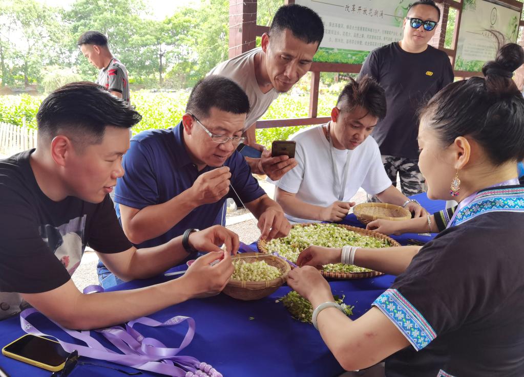 2021年6月,臺青在廣西橫縣的茉莉花盆栽基地體驗茉莉花文創產品制作。新華社發