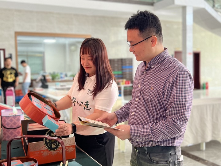 圖為沈益昌(右)和員工在位于陜西咸陽的公司里查看食品禮盒(5月13日攝)。新華社記者蔡馨逸 攝