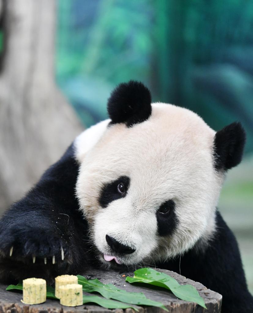 今年8月,臺北動物園為“團團”慶祝了18歲生日。在園方公布的直播視頻里,“團團”獨享一個單層方形蛋糕,細嚼慢咽了好一會兒才把蛋糕掀翻,拿起上面充當蠟燭的甘蔗吃了起來。憨萌的模樣逗樂了不少在線上觀看慶生活動的臺灣民眾。