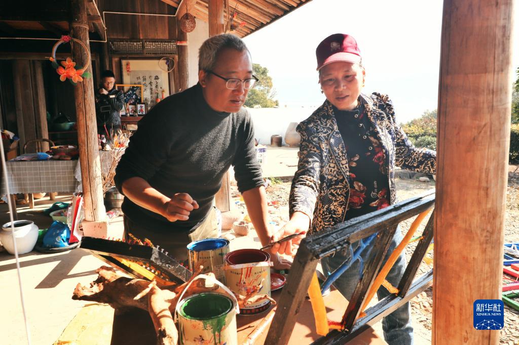 來自臺灣的“藝術鄉建”專家吳立行(左)在浙江寧海駱家坑村指導村民打造駱家小院(資料照片,2020年11月11日攝)。新華社發