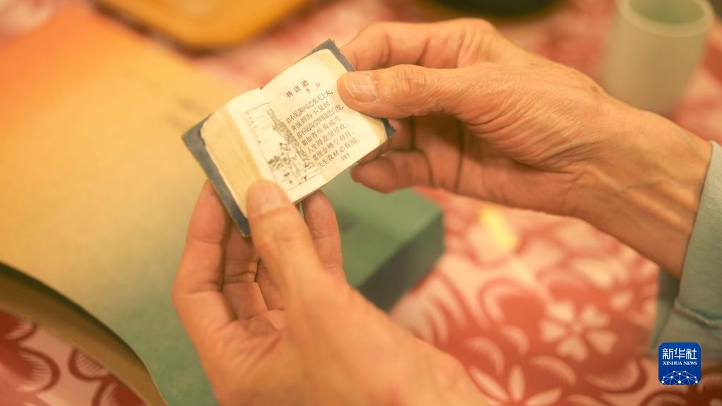黃永松展示隨身攜帶的袖珍版《唐詩三百首》(3月29日攝)。新華社記者 黃揚 攝