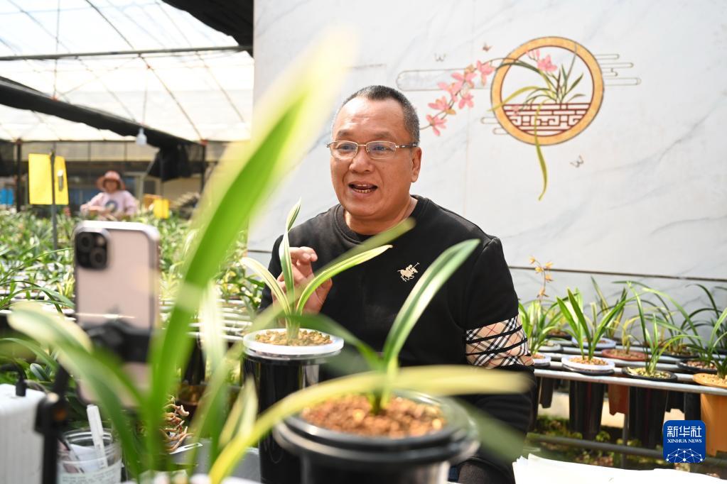 新華社福州5月5日電(記者周義)“在網上和粉絲賞蘭花、聊蘭花,一來二去,顧客越來越多?!痹诟=ㄕ闹莸闹辈ラg內,臺灣農民許傳輝一早就擺上幾盆蘭花,開始“帶貨”。
