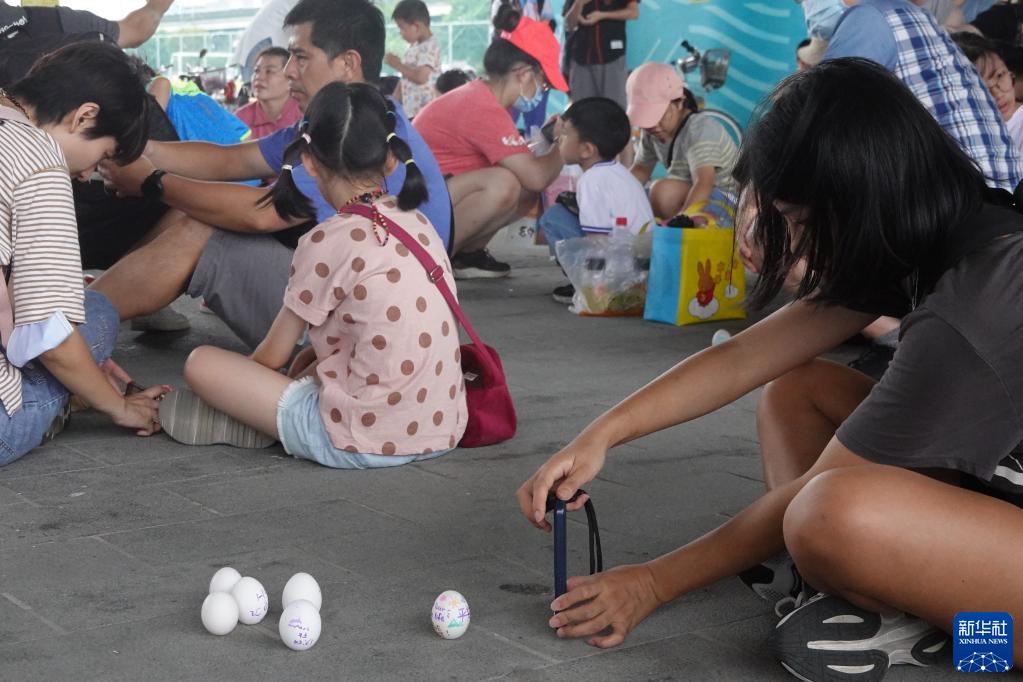 在大佳河濱公園的活動現場,許多家長帶著孩子,用彩筆在雞蛋殼上或繪制各種圖案,或寫下自己的名字和“端午快樂”等字樣,然后嘗試把雞蛋立起來,既緊張又有趣。人們相信,在端午節這天的正午時分,成功把雞蛋豎立起來會給自己和家人帶來一年的好運。