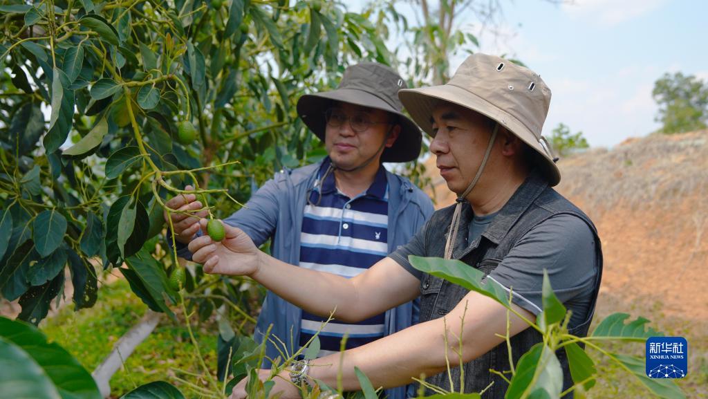 臺商汪志哲(右)在牛油果基地觀察果實長勢(2023年4月27日攝)。新華社發(受訪者供圖)