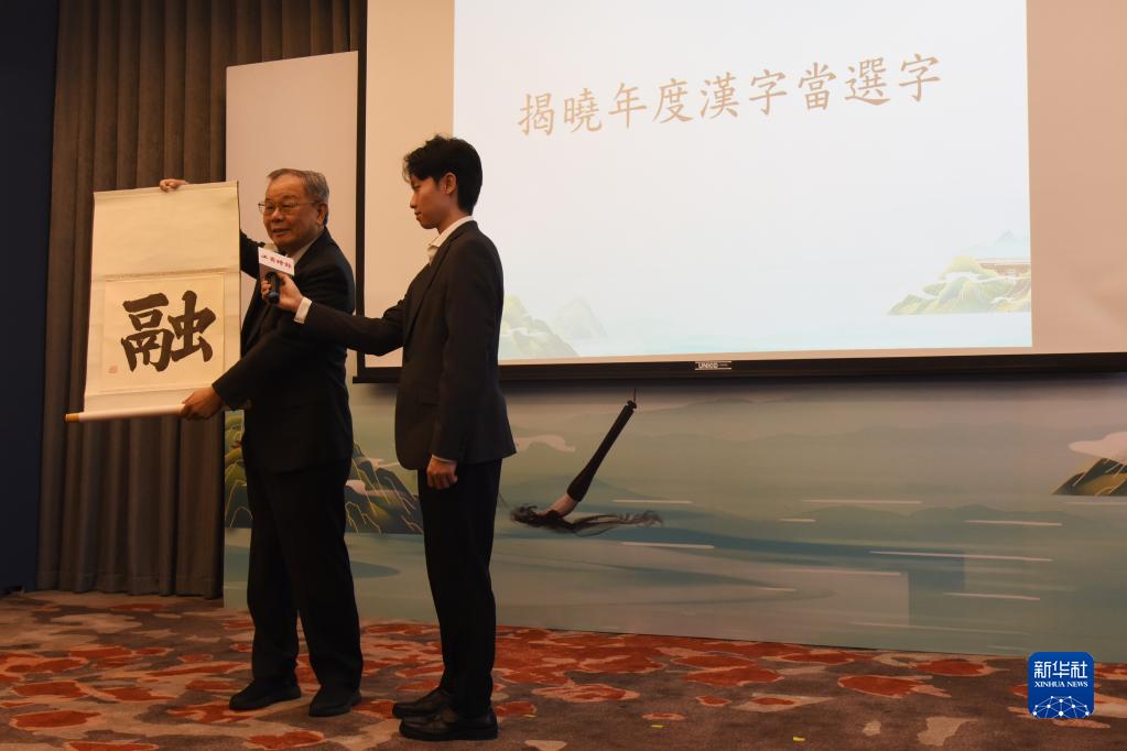 12月8日,由兩岸有關機構共同主辦的2023海峽兩岸年度漢字評選結果在臺北揭曉,“融”字以最高票當選。這是臺灣中華書學會會長張炳煌(左)揭曉年度漢字。新華社記者 劉斐 攝