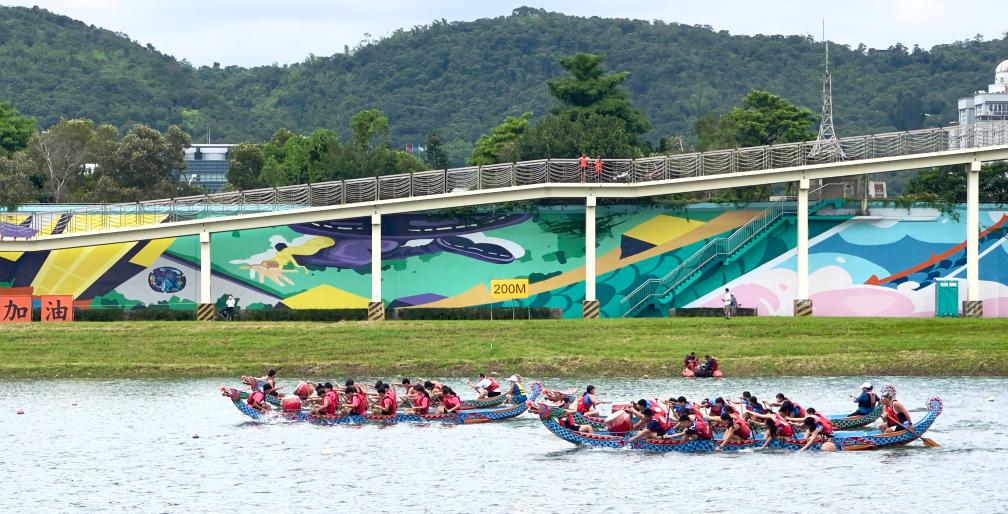 新華社臺北6月10日電(記者王承昊、章利新)發令號響,一艘艘龍舟如離弦之箭向前沖去。鼓手坐在船頭飛舞鼓槌、節奏激昂,槳手動作整齊劃一,激起層層浪花,岸邊旌旗招展,助威打氣的吶喊聲此起彼伏……這是10日端午節當天,臺北基隆河上的精彩一幕。