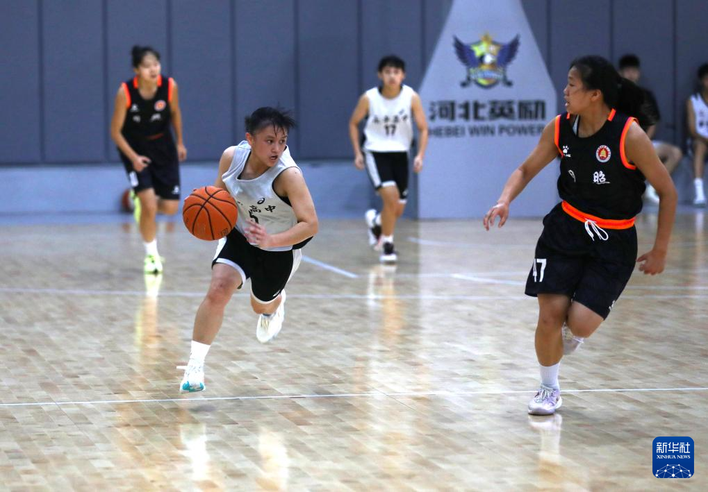 8月5日,在2024年首屆“英勵杯”冀臺青少年女子籃球邀請賽上,新北市立永平高級中學女子籃球隊的隊員帶球突破。新華社記者 任麗穎 攝