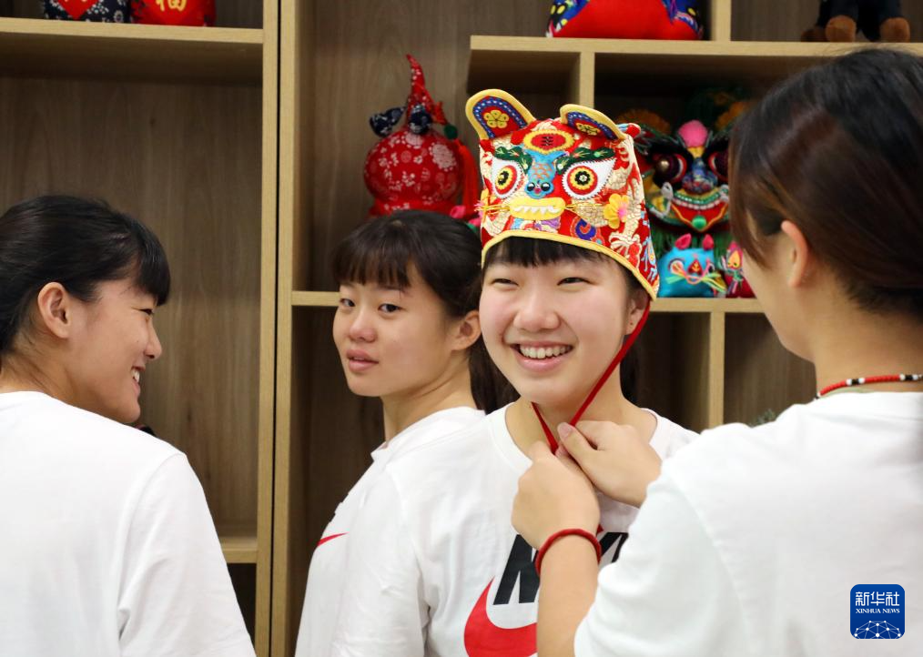 8月10日,臺灣學生在河北衡水中學戴上非遺文化作品虎頭帽。新華社記者 任麗穎 攝