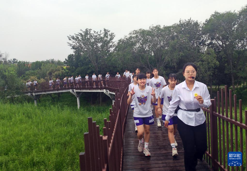 8月9日,臺灣兩所學校師生行走在衡水湖梅花島棧道上。新華社記者 任麗穎 攝