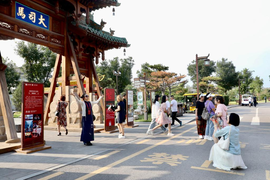 8月21日,一位臺灣女企業家在太原古縣城一處牌樓前打卡拍照。新華社記者 樊欣陽 攝