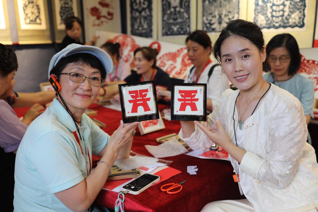 8月21日,晉臺女企業家拿著剛做好的剪紙作品合照。新華社記者 樊欣陽 攝