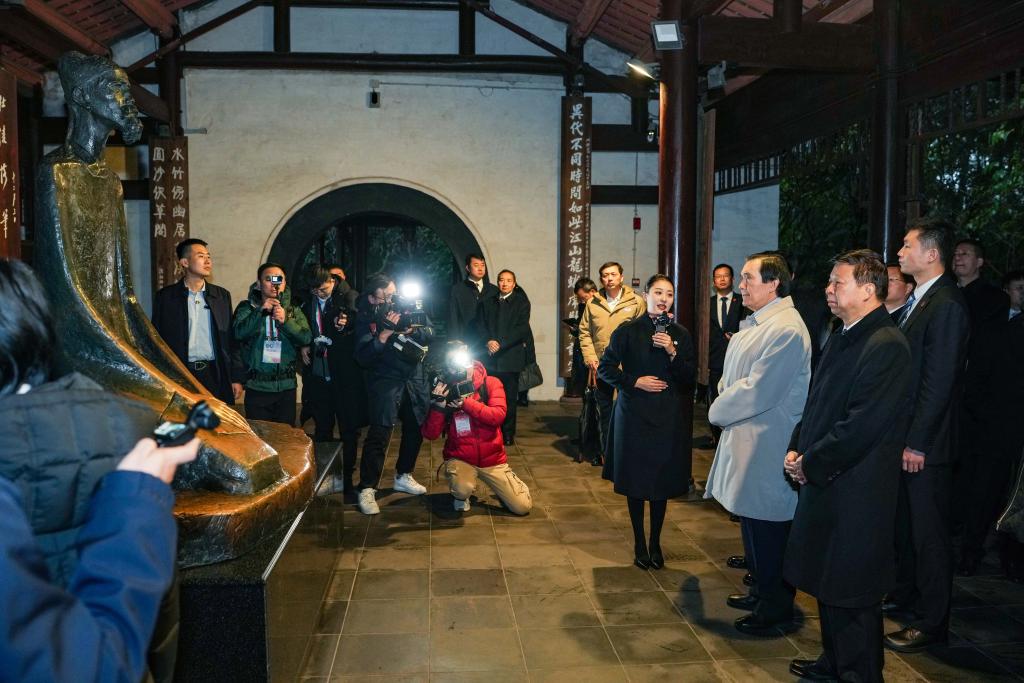 座談會前,中共中央臺辦、國務院臺辦主任宋濤(前右一),中國國民黨前主席馬英九(前右二)等參觀杜甫草堂博物館。新華社記者 陳曄華 攝