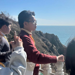 臺灣學生簡星宇(右二)與同學在大連旅順老鐵山觀景臺俯瞰黃渤海分界線(4月24日攝)。新華社記者 李妍 攝