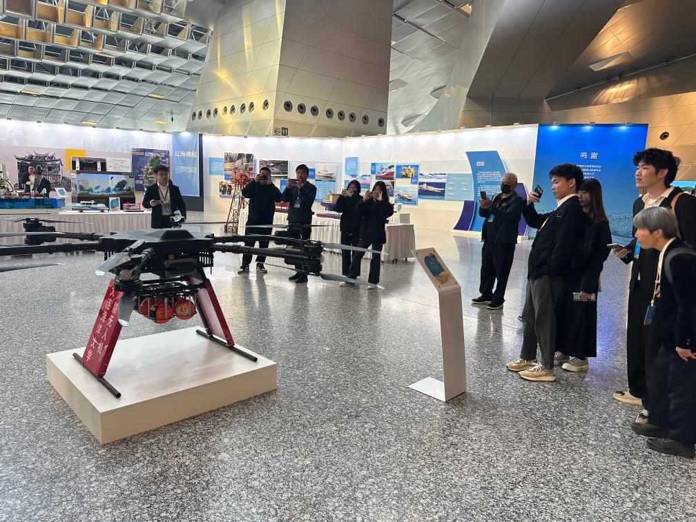在大連國際會議中心船政歷史展覽廳內,臺灣同胞參觀由大連海洋大學自主研發的大載重無人機(4月23日攝)。新華社記者 李妍 攝