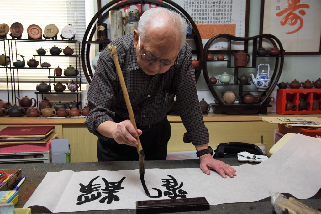 在位于臺北的工作室“洪廬藝術小筑”里,臺灣書法家洪啟義在寫書法(4月15日攝)。新華社記者 劉斐 攝