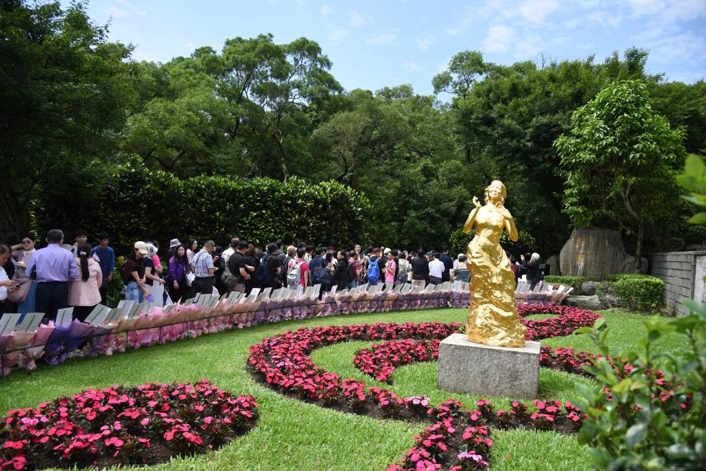 “君聲麗影,歲歲年年”“時光匆匆30載,我只在乎你”……在花圃拼成的音符中央,鄧麗君的金色雕像亭亭玉立,被歌迷們送來的鮮花簇擁。