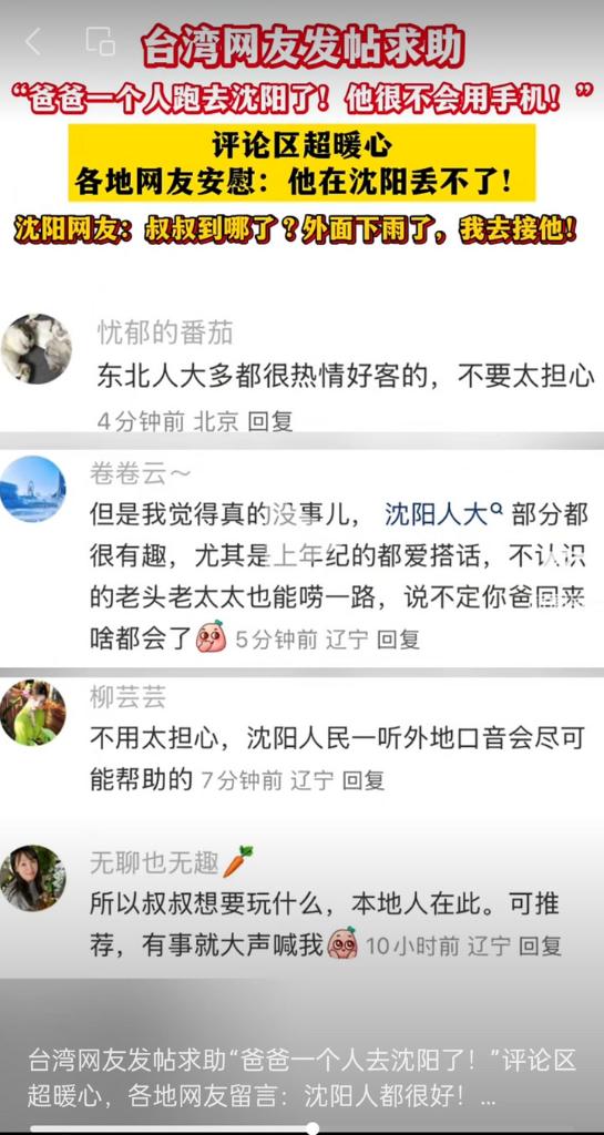 近日,一則來自臺灣網友的小紅書求助帖一經發出,評論區瞬間熱鬧:“咱叔走到哪兒了,用我去接他不?”“沒事,丟不了!”“本地人在此,有事就喊我?!?/p>