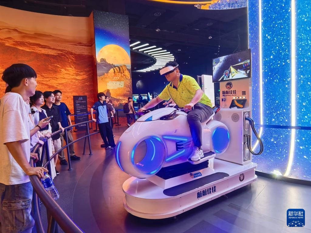 7月5日下午,參加夏令營活動的臺灣青年在珠海太空中心體驗互動項目。新華社記者 許曉靜 攝