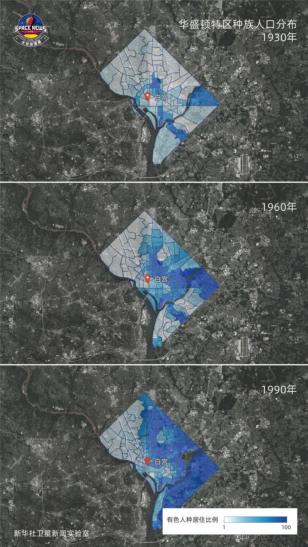 1930年的華盛頓特區,以白宮為原點,各個方向幾乎都分布著有色人種聚居區。90年過去,雖然有色人種數量快速增加,但城市更加明顯地向東西兩個方向分裂。
