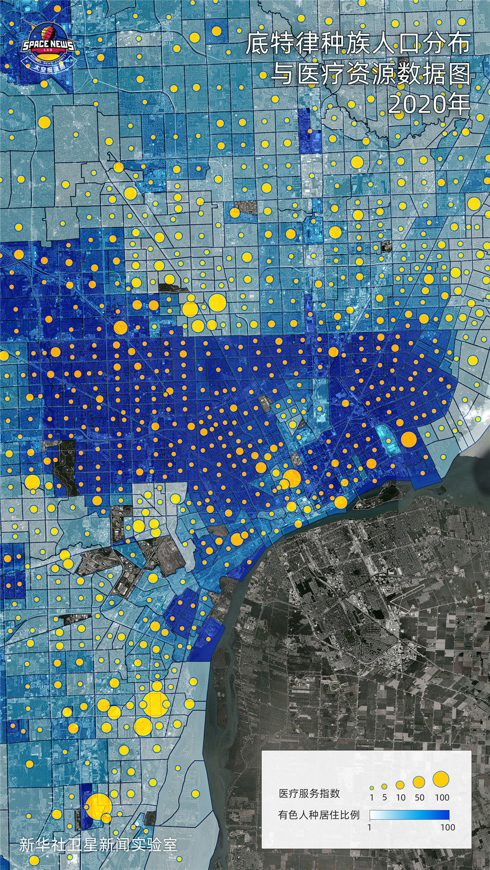 在這張根據Open Street Map開源數據制作的數據地圖中,黃色圓點越大,代表區域內人均可獲得的醫療資源越多。實際上,僅看分布密度,有色人種社區就與白人社區存在明顯差異。