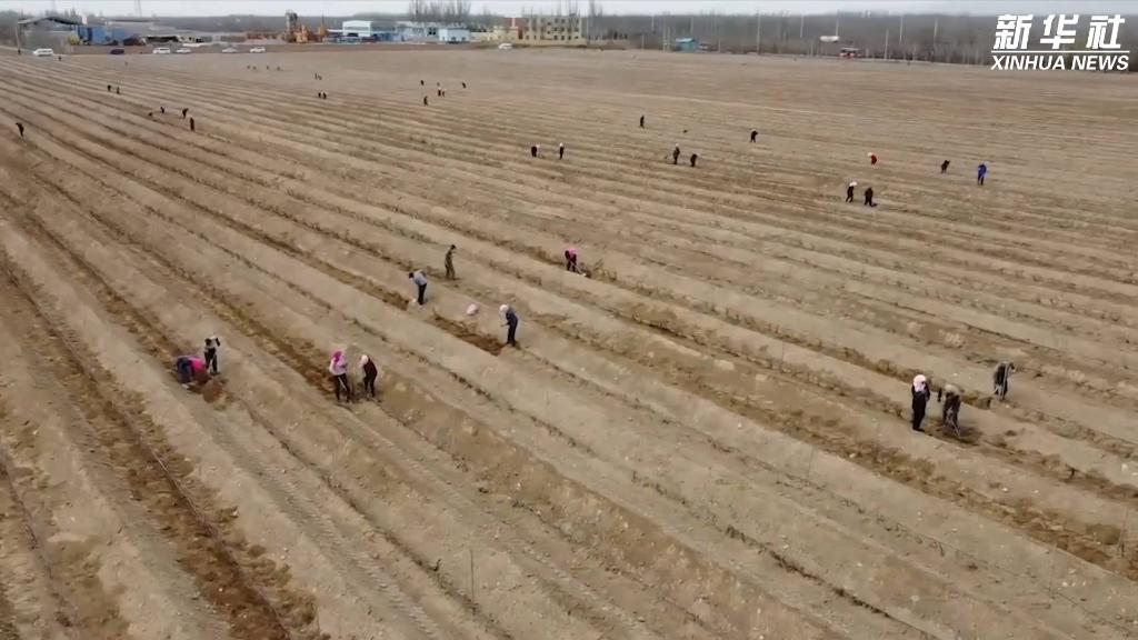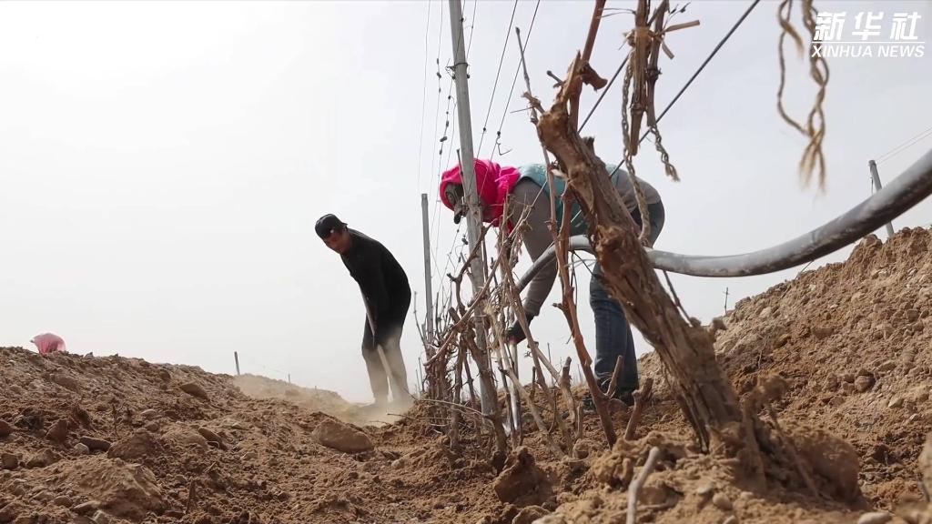 目前,寧夏賀蘭山東麓葡萄酒產區正在開展展藤工作。