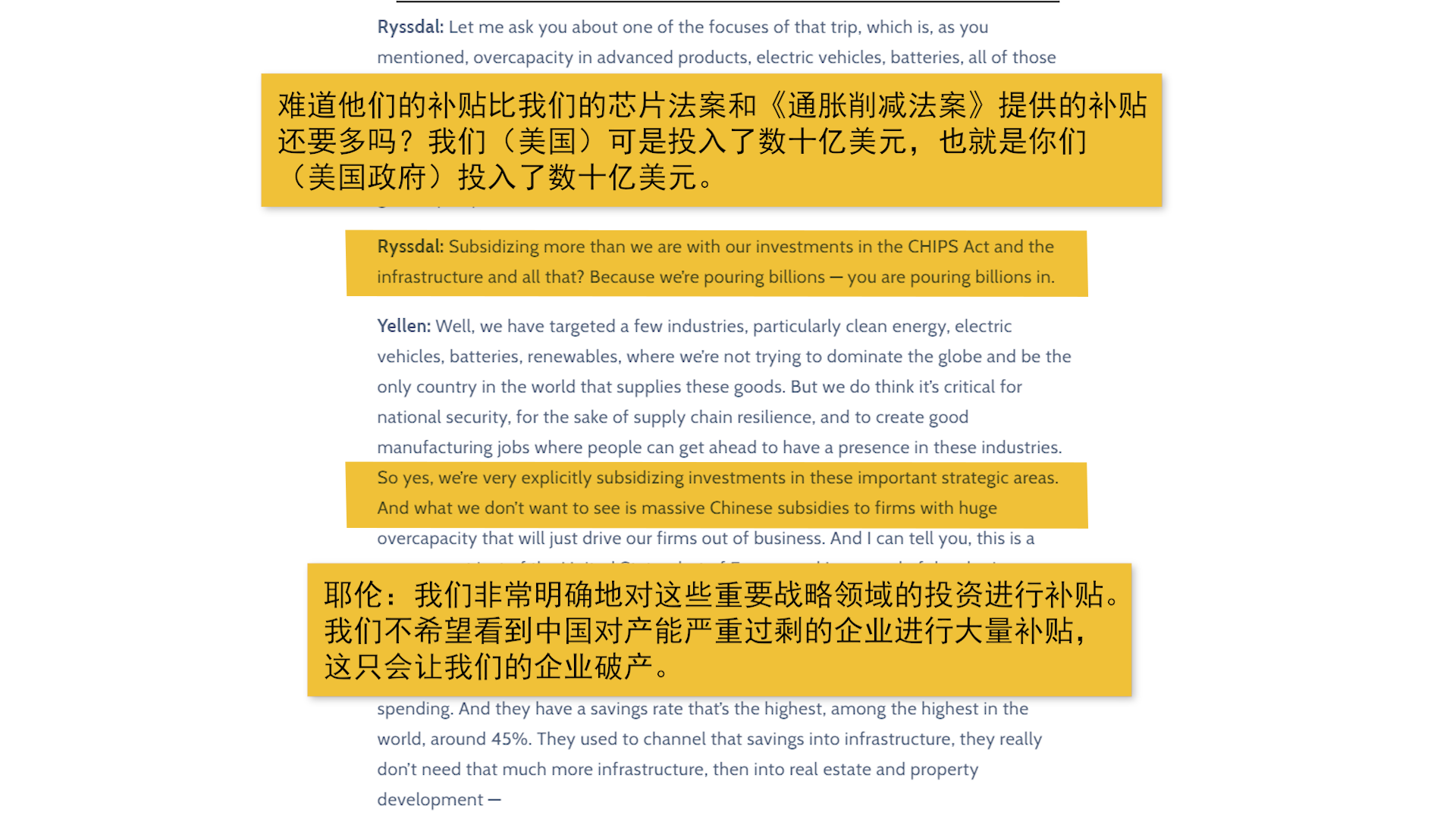 美國把矛頭指向中國政府對中國新能源車實施的稅收減免和補貼政策。美國財政部長耶倫在接受采訪時說到: