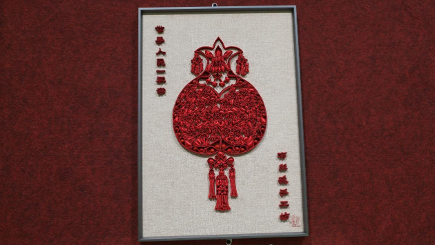 盤扣作品《世界人民一家親》以“團結”為設計理念,將石榴作為主體形象,運用手工盤扣技藝制作而成。石榴的果實部分由佩戴各民族不同頭飾的笑臉組成,象征著各族人民緊密相連、休戚與共,像石榴籽般緊緊團結在一起。